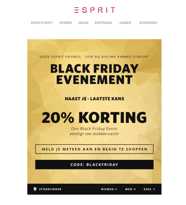 De afgelopen jaren krijgt Black Friday ook voet aan de grond in Nederland. Meer en meer winkels bieden Black Friday kortingen, zo ook Esprit: