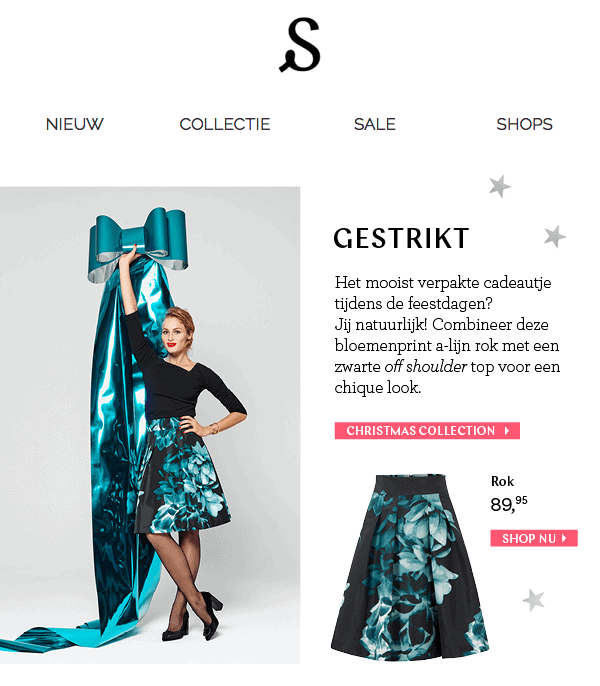 Besteed daarom in een mail ook aandacht aan welke cadeaus jij op voorraad hebt voor het eigen plezier van je klanten. Kijk bijvoorbeeld eens hoe Steps dit deed: