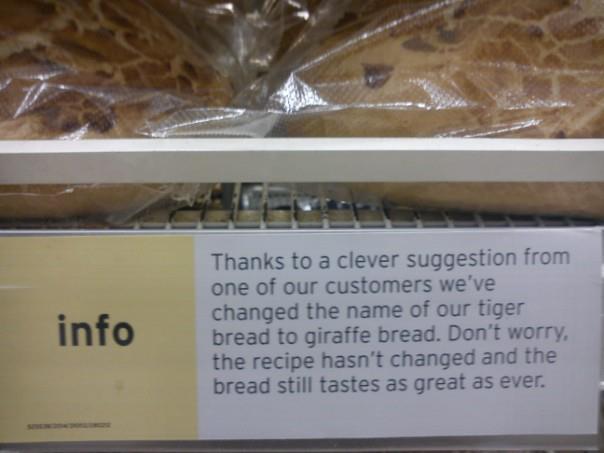 Chris King (leeftijd 27 en 1/3) van het customer service team van Sainsbury stuurde Lily een brief terug. Hij vond het een briljant idee. Inderdaad, het brood leek helemaal niet op de strepen van een tijger. De vlekken van een giraf omschreven het patroon veel beter. Lily kreeg een cadeaubon als dank voor de suggestie.